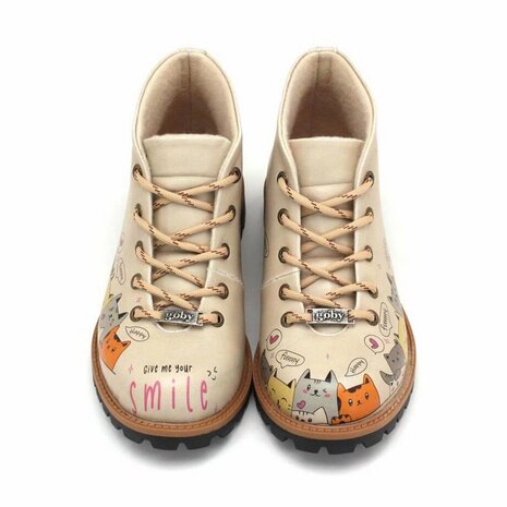 Zaubern Sie sich (und anderen) mit den Goby CatMood Boots ein Lächeln ins Gesicht. Diese handgefertigten Schnürstiefel sind aus weichem, beigem veganem Leder gefertigt und mit einer fröhlichen Reihe von Cartoon-Katzen bedruckt, ergänzt durch verspielte Wörter wie „happy”, „funny” und „smile”. Eine einzigartige Mischung aus Stil, Humor und Komfort – perfekt für Katzenliebhaber mit eigenwilligem Geschmack.