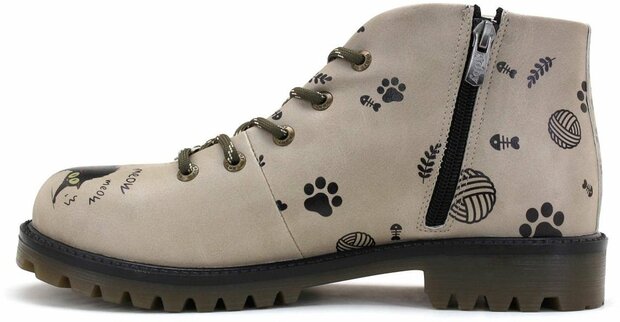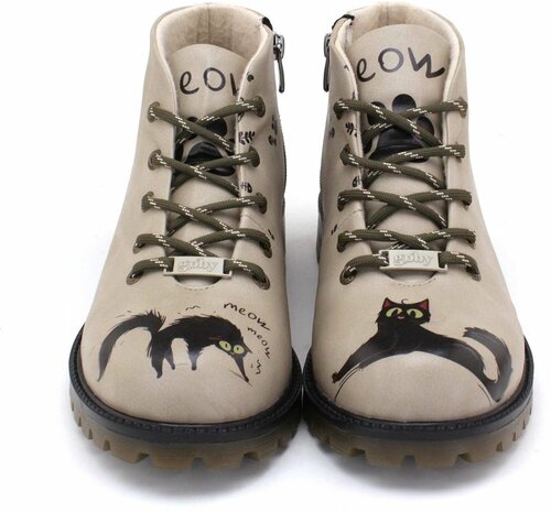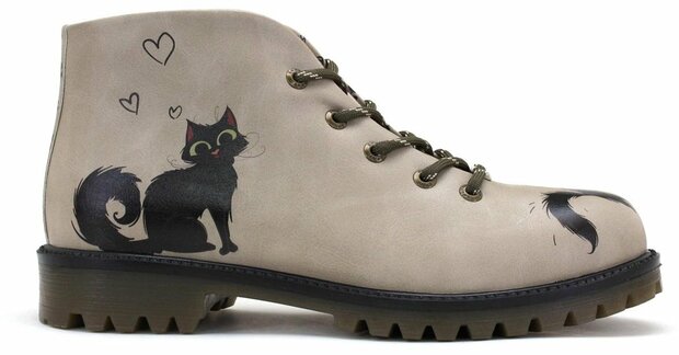 Laat je persoonlijkheid spreken met deze unieke Goby damesboots in maat 35. De beige basis is verfraaid met een speels design van een zwarte kat, hartjes en pootafdrukken – perfect voor kattenliefhebbers die houden van originele mode.