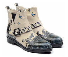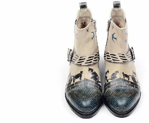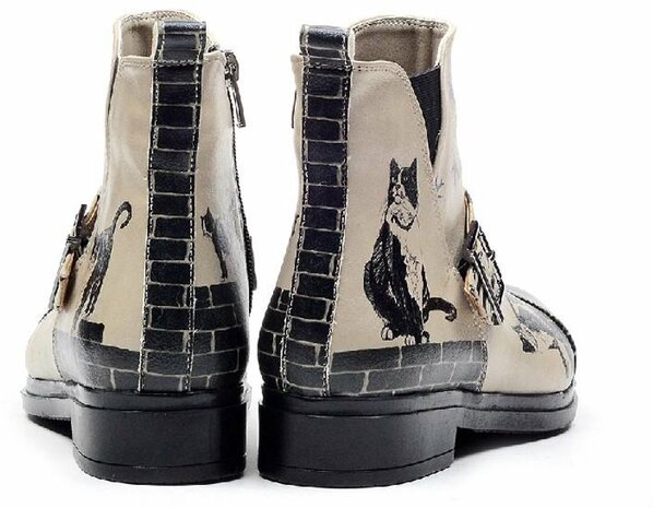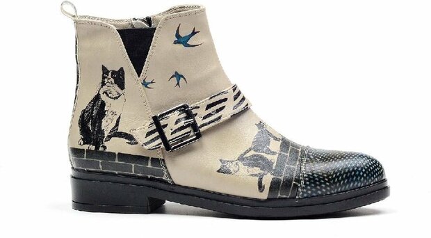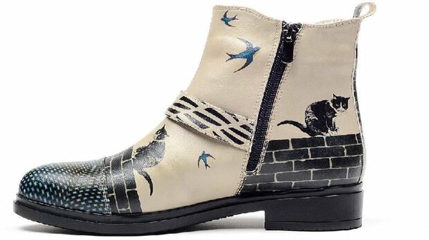 Laat je stijl opvallen met de Goby Catwalk dames enkellaarsjes, perfect voor liefhebbers van katten en kunstzinnige ontwerpen. Deze handgemaakte enkellaarsjes van hoogwaardig vegan leer zijn voorzien van een speelse print met katten die over daken wandelen, terwijl zwaluwen sierlijk door de lucht vliegen. De unieke combinatie van zwart-witte patronen en subtiele details maakt deze laarsjes een ware eyecatcher.