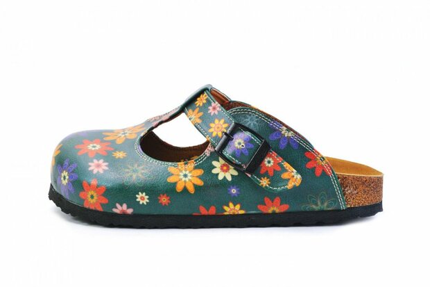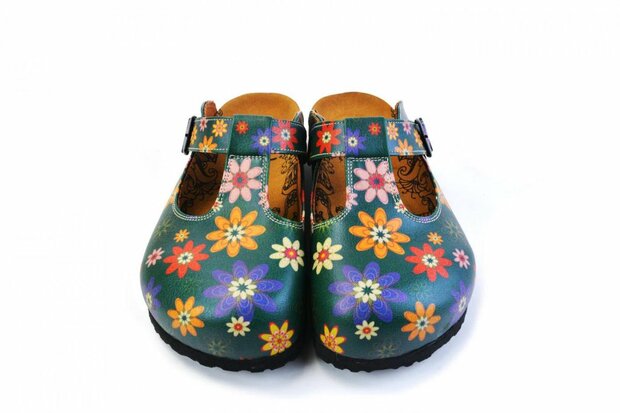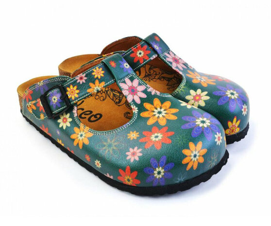 Vrolijk design: Een bonte bloemenmix op een diepe groene achtergrond – opvallend, vrolijk en vrouwelijk. Handmade: Elk paar is met de hand gemaakt met aandacht voor kwaliteit en afwerking. Vegan en comfortabel: Diervriendelijke materialen met een zacht voetbed en stevige zool. Verstelbaar bandje: Voor extra pasvorm en ondersteuning.