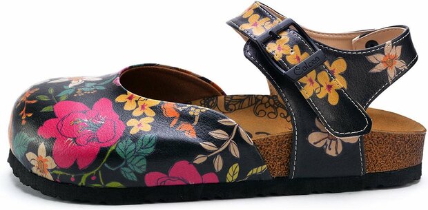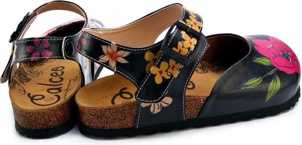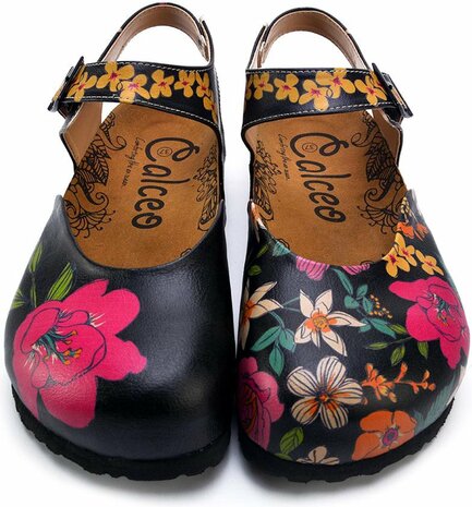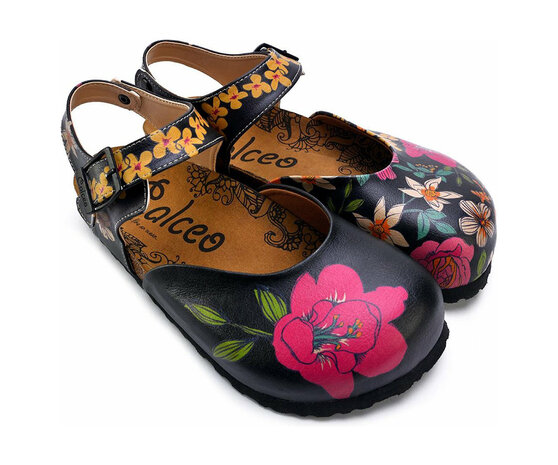 Met een vrolijk, asymmetrisch bloemenontwerp op een zwarte basis en een charmante Mary Jane-stijl met verstelbare enkelband, zijn deze clogs perfect voor wie wil opvallen zonder in te leveren op draaggemak.