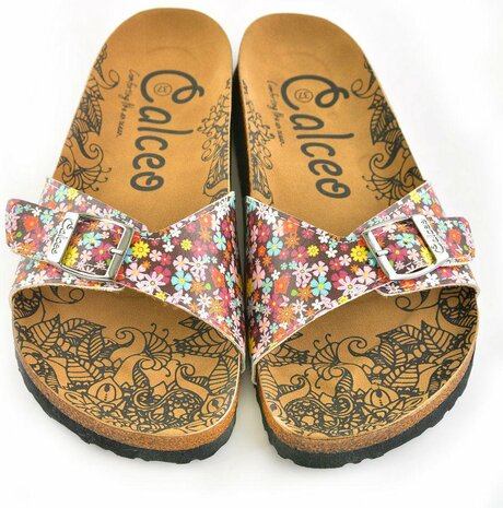 Het ontwerp bestaat uit een fijne bloemenprint in allerlei tinten, van pastel tot fel, op een diepe bruine achtergrond. De brede band met gesp zorgt voor een stevige en verstelbare pasvorm, perfect voor zomerse dagen.