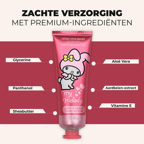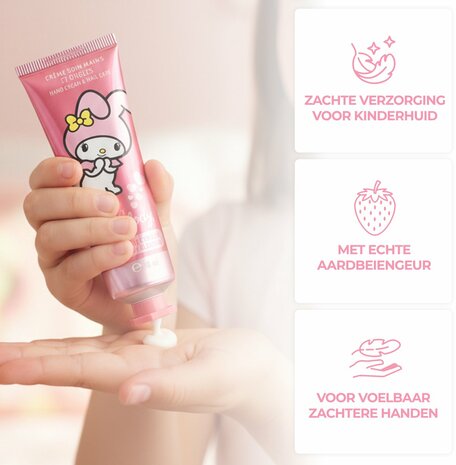 Hello Kitty Melody Handcrème is perfect voor kleine handjes en biedt intense hydratatie. Elke tube verspreidt een magische geur die de zintuigen van je kinderen stimuleert terwijl hun handen worden verzorgd. De handige verpakking maakt het makkelijk om de handcrème overal mee naartoe te nemen - op school, onderweg of thuis.