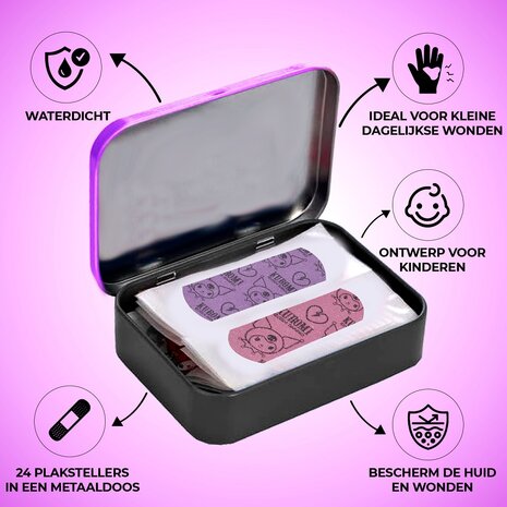 De pleisters worden geleverd in een compact en herbruikbaar metalen doosje dat makkelijk in elke tas past. Dankzij het waterdichte en huidvriendelijke materiaal bieden ze veilige en comfortabele bescherming bij oppervlakkige wondjes.