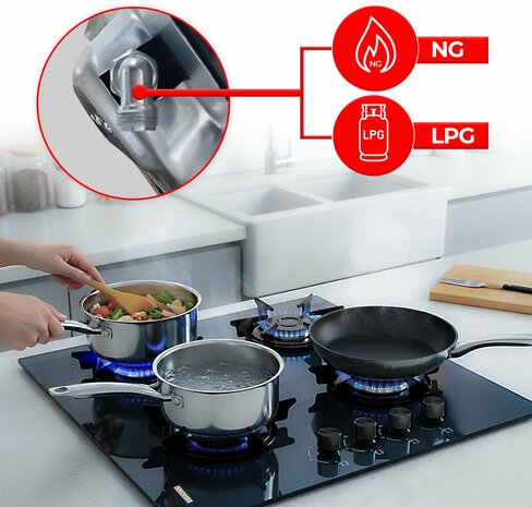 Dankzij de aanpasbare instellingen kun je deze kookplaat zowel met aardgas als LPG gebruiken.