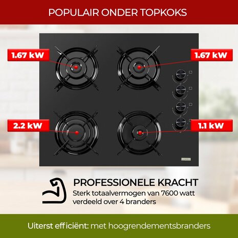 - Linksvoor (2,2 kW): Ideaal voor snel koken en roerbakken.