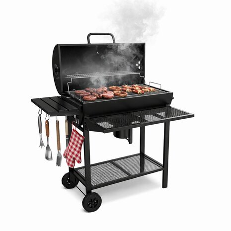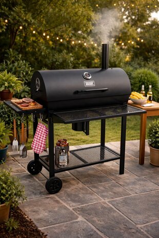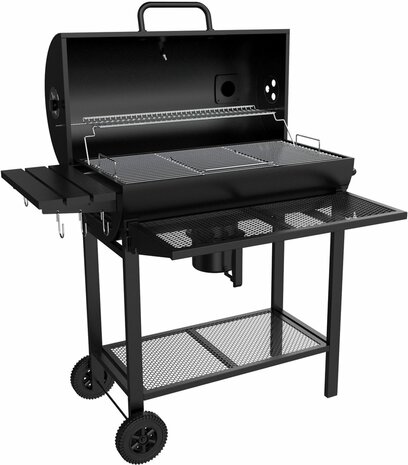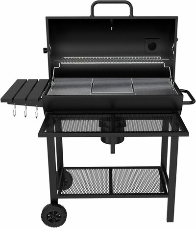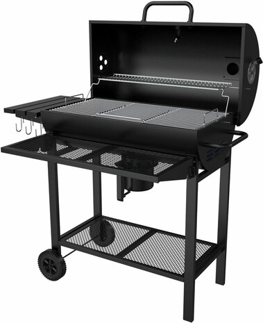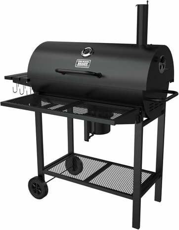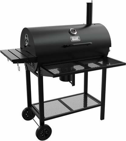 De barbecue is uitgevoerd in een stoere zwarte metalen afwerking en staat stevig op zijn onderstel. De handige opbergruimte onder het grillgedeelte en de praktische zijtafel zorgen ervoor dat houtskool, gereedschap en ingrediënten altijd binnen handbereik zijn.