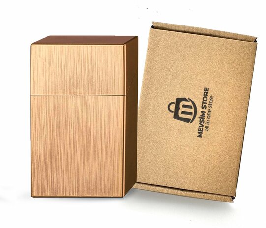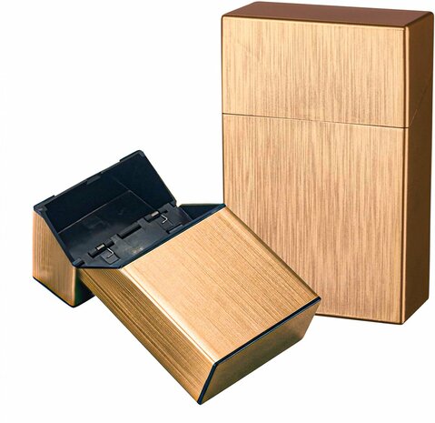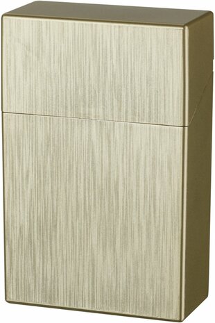 De sigaretten box is vervaardigd uit hoogwaardig aluminium en afgewerkt met een luxe goudkleurige, geborstelde afwerking. Het stevige materiaal beschermt je sigaretten tegen druk, breken en vocht, terwijl de weerbestendige constructie ervoor zorgt dat je sigaretten in goede staat blijven, ook bij wisselende omstandigheden.
