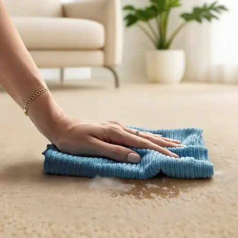 Fleckenreinigung: Befeuchten Sie den Fleck und wischen Sie ihn dann mit dem Tuch ab. Bei hartnäckigen Flecken verwenden Sie Purimax Teppich- und Möbelreiniger für hohe Leistung.