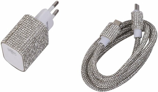 Breng elegantie en kracht samen met de Tekmee oplaadset. Deze stijlvolle set bestaat uit een 20W USB-C snellader adapter en een 40W USB-C kabel van 1 meter, afgewerkt met een luxueuze kristalsteen look. Perfect voor iedereen die waarde hecht aan zowel snelheid als design.